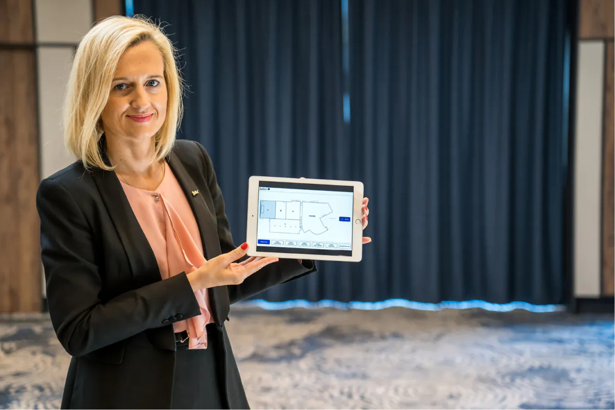 Dyrektor hotelu Radisson Blu w Sopocie, Katarzyna Dowgiałło-Edel prezentuje interfejs systemu sterowania AMX pracujący na tablecie iPad.