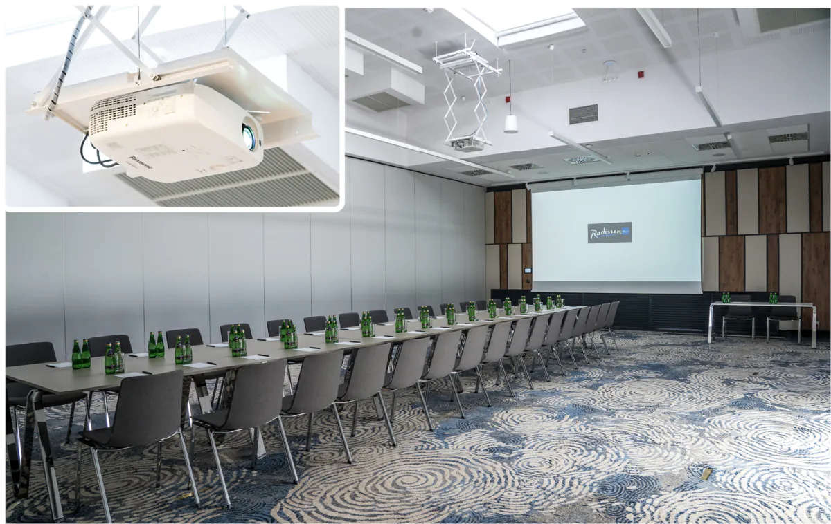 Hotel Radisson Blu oprócz ogromnej przestrzeni konferencyjnej dysponuje także mniejszymi salami. Jedna z nich znajduje się na tym samym poziomie, co centrum konferencyjne, pozostałe umieszczone zostały na parterze. Wszystkie sale, a jest ich łącznie pięć, wyposażone są w monitory LG 65UL3E zamontowane na wózku Edbak TR100. Ciekawym pomysłem jest hybrydowe wykorzystanie części sali restauracyjnej. Zamykając ścianę ruchomą, możliwe jest wydzielenie jej z restauracji i przekształcenie w dwie niewielkie, prywatne sale eventowe. W tej części obiektu dostępne są też przyłącza opisanej wcześniej sieci AV-over-IP, więc goście mogą uczestniczyć w wydarzeniu odbywającym się w centrum konferencyjnym, jednocześnie relaksując się w nieco bardziej kameralnym gronie.